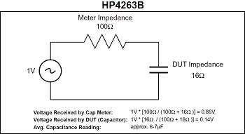 當(dāng)從測試設(shè)備中將1.0 Vrms的電壓加到電容器時,電壓在儀表阻抗和電容器阻抗之間被分壓。對于HP4263B測試儀,其阻抗保持為100 Ω不變(圖1),而對于HP4278A測試儀,計算的電容器阻抗變?yōu)?.5 Ω(圖2)。結(jié)果表明,對于HP4263B測試儀,絕大多數(shù)外加電壓會降低在測試儀阻抗中,而HP4278A測試儀可以使電容器能夠接收大部分外加電壓。因此,HP4263B測試儀顯示的測量值將低于真實值。