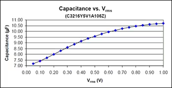 如果將測試儀表的OSC電壓設(shè)置為1.0Vrms,不能保證在電容器上施加全部外加電壓。因此,當(dāng)發(fā)現(xiàn)電容器上的電壓約為設(shè)定值的10%時,也就不足為奇了(圖3)。該圖顯示了低VAC如何影響測得的電容值。
