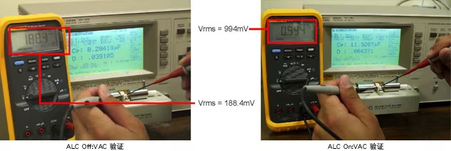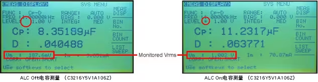 下圖展示了ALC on和off之間的差異。當(dāng)ALC功能off時,電容器上的實際電壓約為1.0Vrms設(shè)定電壓的10%。當(dāng)ALC功能on時,電容器上的電壓幾乎是設(shè)定電壓的100%。HP4284A具有電壓和電流等級監(jiān)視器,但還是可以使用伏特計驗證實際電壓。